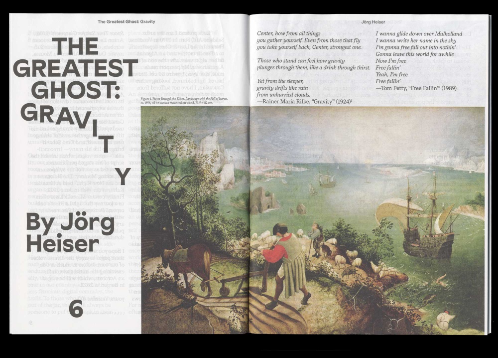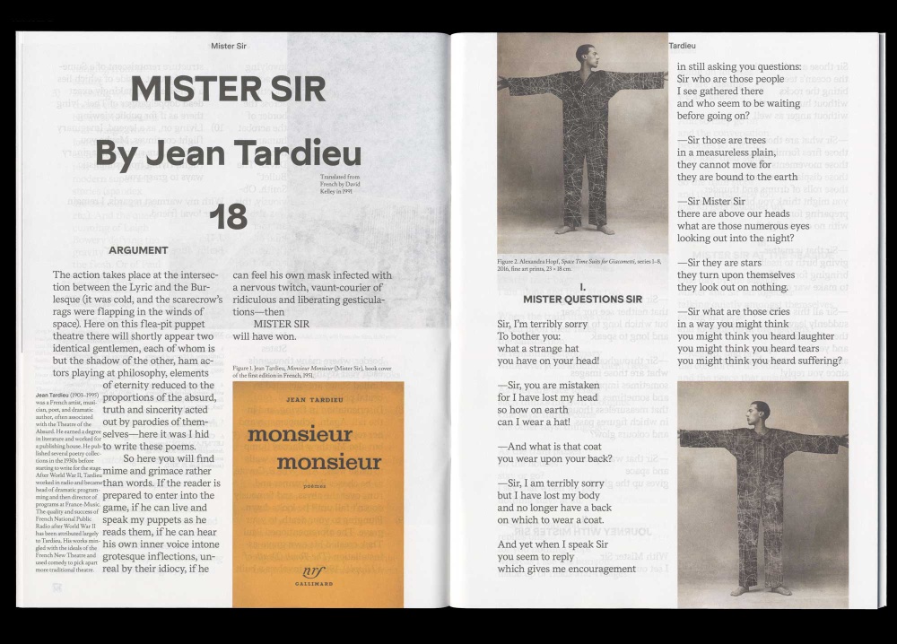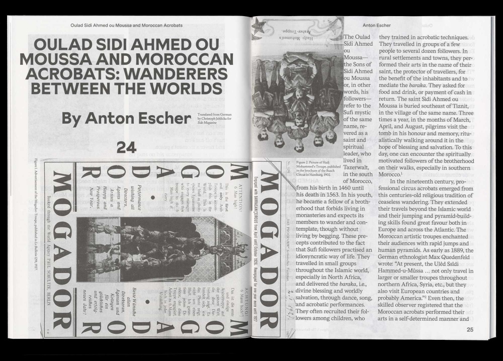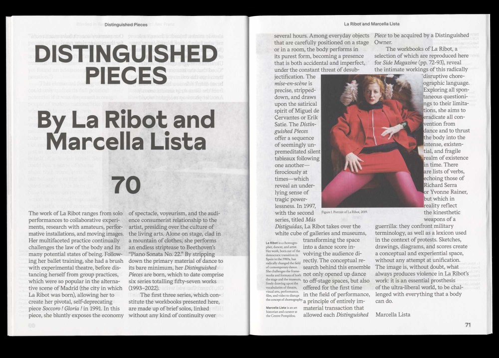 The seventh and last issue of Side Magazine is dedicated to the character of an Acrobats (“who are two but together as one,” as Thomas Clerc says in his play, The Heptahedron). Two in one is the promise of a self, freed from the deadening game of immutable identities. Walking on their hands, upside down, feet in the air, defying gravity, an Acrobats invite us to overthrow the established order. Seven contributors shed light on this figure: Jörg Heiser takes us on an ever-twisting journey through the universal force of gravity; Anton Escher looks at how a group of Moroccan acrobats have been invited around the world to demonstrate their prowess, participating in the modern tradition of highly-skilled migration; Anri Sala and Tacita Dean contextualise Sala’s work A Spurious Emission (2007); Gerald Bär tells us how Fernando Pessoa used specific literary strategies to encourage the sense of strangeness in himself; Eran Schaerf brings to life his many inner voices, which inhabit the script of his performance Blinded in Remembering the Present? Ask Franz; and finally, curator Marcella Lista offers us a journey through La Ribot’s conceptual Distinguished Pieces series, with selected pages from the legendary choreographer’s notebooks published as facsimiles.