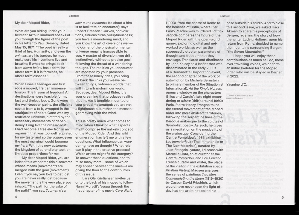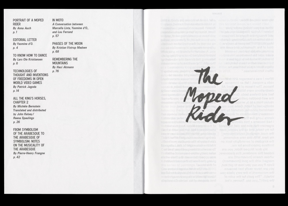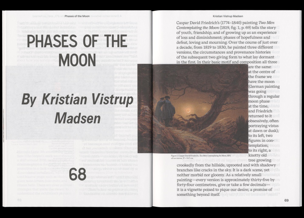 The second issue of Side Magazine is dedicated to the manifold figure of the Moped Rider, which is approached differently by the seven contributors. These include the film critic Lars Ole Kristiansen, who follows Nanni Moretti’s vespa through Rome in the movie Caro Diario (1993), playing the role of a tourist in his own life. A reprinted chapter from Michele Bernstein’s autofiction novel All the King’s Horses (1960), tells the tale of late-night meanderings through Paris, and Kristian Vistrup Madsen addresses the changing intimacy between the musing figures in Caspar David Friedrich’s series of paintings Two Men Contemplating the Moon (1819–c. 1830). Side Magazine’s executive editor Yasmine d’O. is in conversation with curators Marcella Lista and Lou Ferrand about the place and movement of visitors in exhibition spaces.