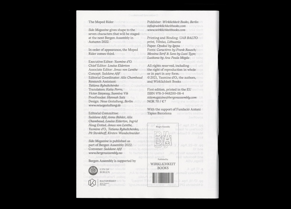 Side Magazine is conceived of as a site of research, each issue giving shape to one of the seven characters that will be staged at Bergen Assembly in 2022, convened by artist Saâdane Afif.